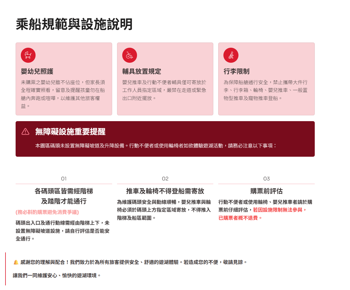 本園區目前未全面設置無障礙坡道與升降設備,使用輪椅或行動不便者若欲參與觀光船活動,請先電話確認是否能提供協助或安全登船。若因設施限制無法參與,恕不退票或補償。