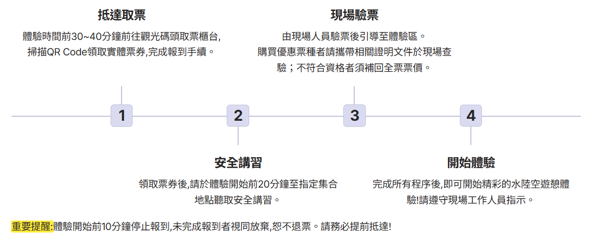 2.領取票券後,請於體驗開始前20分鐘至指定集合地點聽取安全講習,並由現場人員驗票後引導至體驗區。