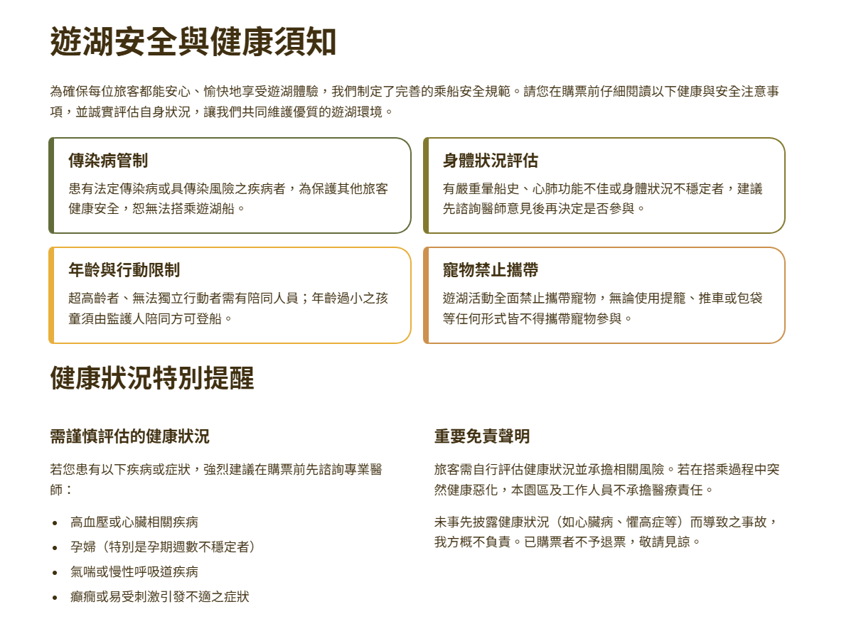 若您有以下健康狀況,我們建議您在官網購票前,先諮詢醫師意見並評估身體狀況,以確保能安心、愉快地享受遊湖時光。