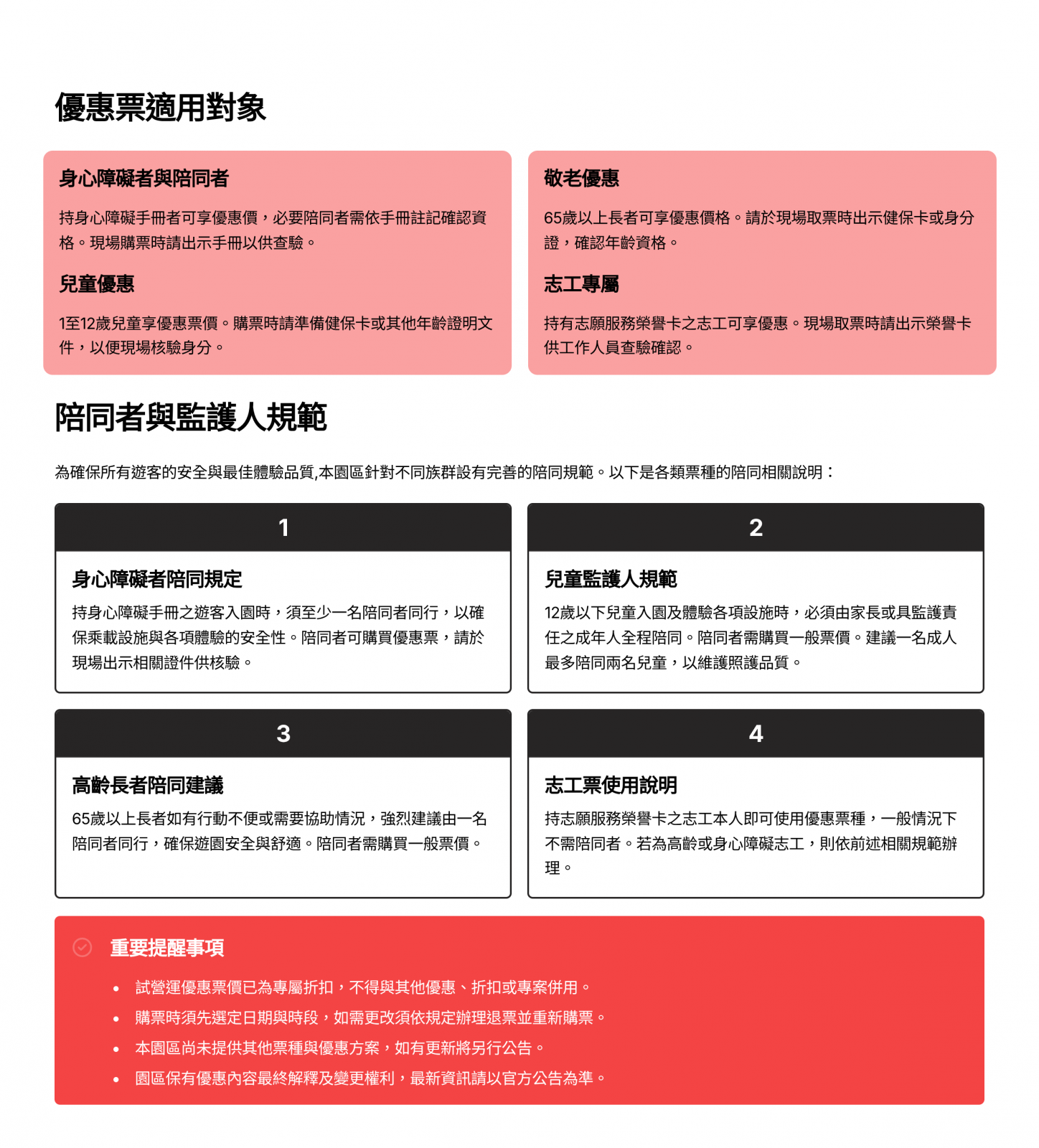 - 🔹 身心障礙及必要陪同者(現場取票時須查驗持身心障礙手冊,必要陪同者現場看身障卡註記 有註記陪同者才享有優惠。)