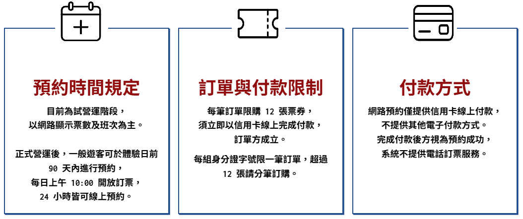 正式營運後,一般遊客可於體驗日前 90 天內進行預約(每日皆可訂票),開放時間為每日上午 10:00 起,24 小時皆可線上訂票。