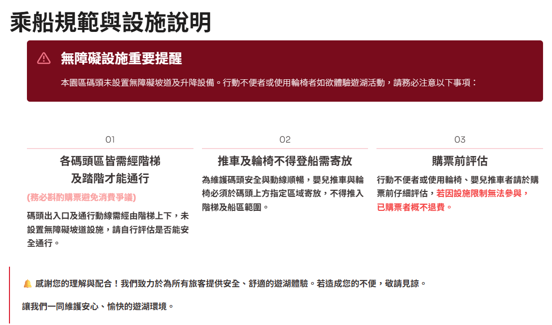 本園區目前未全面設置無障礙坡道與升降設備,使用輪椅或行動不便者若欲參與觀光船活動,請先電話確認是否能提供協助或安全登船。若因設施限制無法參與,恕不退票或補償。