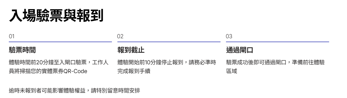 2.領取票券後,請於體驗開始前20分鐘至指定集合地點聽取安全講習,並由現場人員驗票後引導至體驗區。
