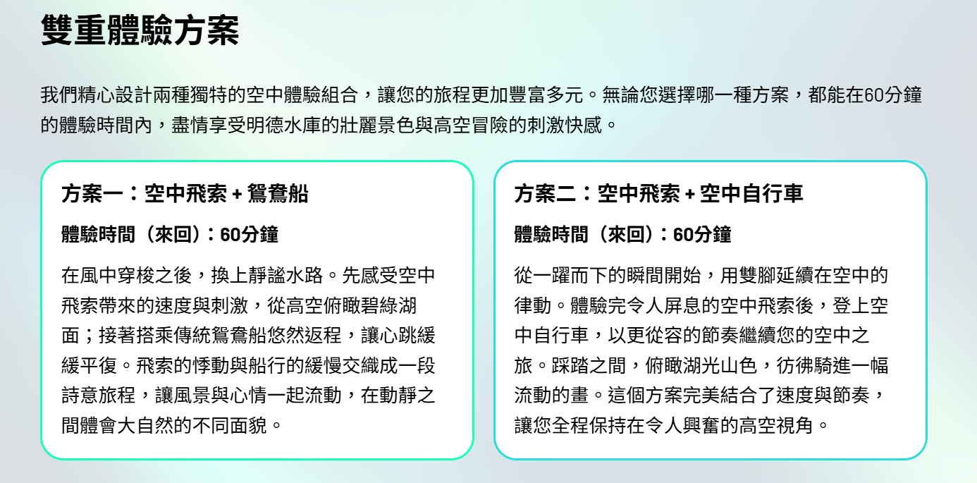 在苗栗明德水庫的湖光山色中,體驗前所未有的高空冒險。我們提供兩種獨特的空中體驗方案,讓您在安全專業的環境下,享受刺激與寧靜交織的難忘旅程。為確保每位參與者都能獲得最佳體驗品質與安全保障,