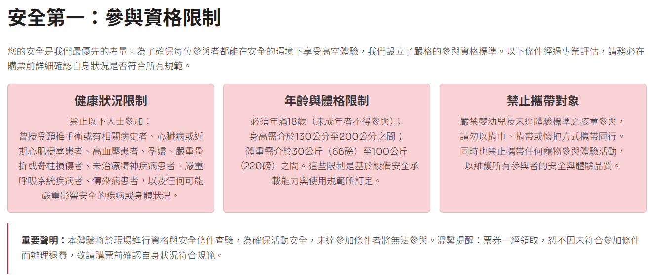 ※本體驗將於現場進行資格與安全條件查驗,為確保活動安全,未達參加條件者將無法參與。