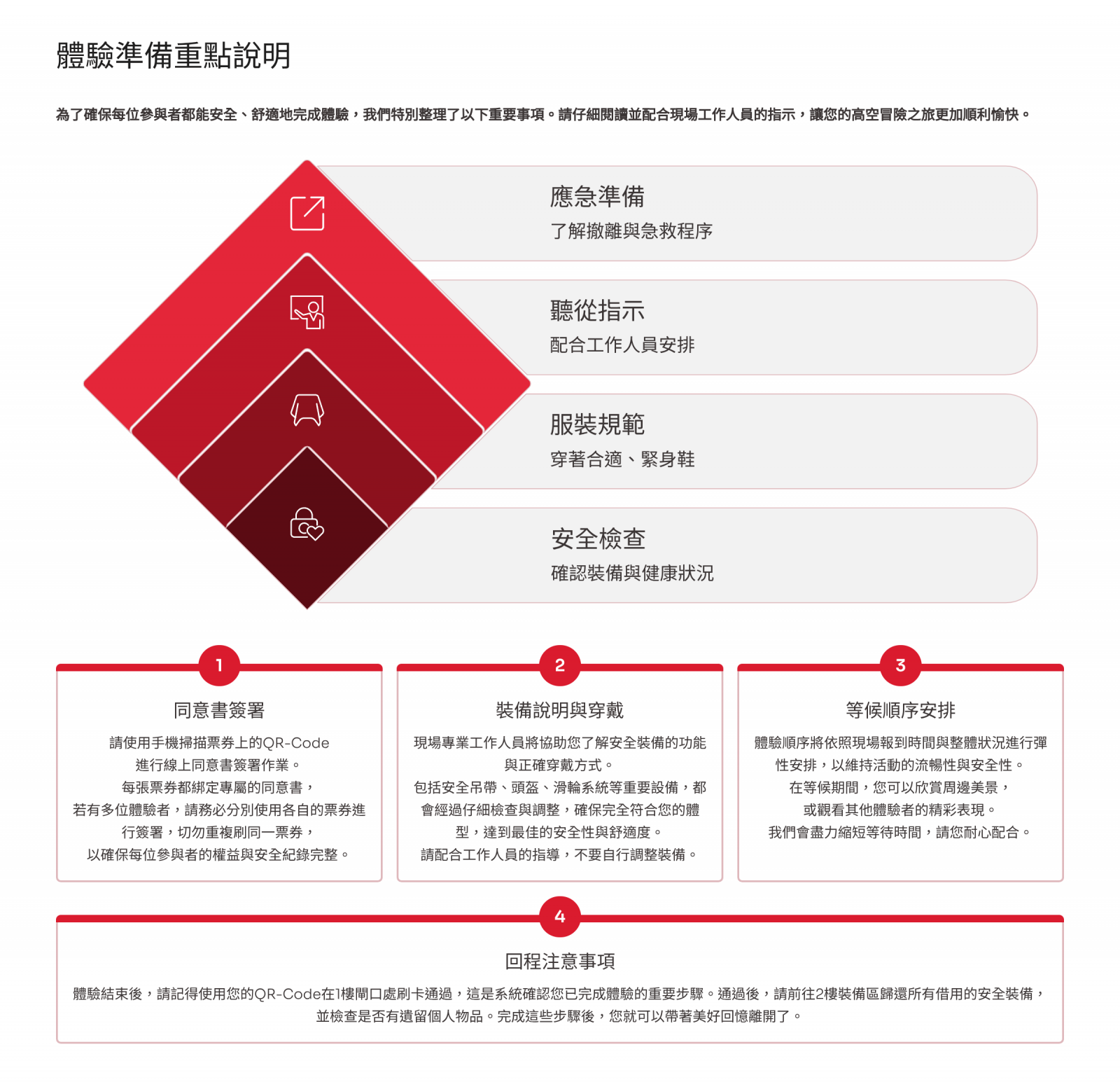 為讓您安心又開心地享受高空滑索活動,請配合以下事項: